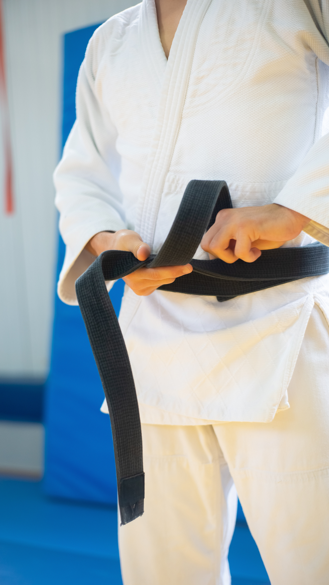 Consiste em um casaco, calças e um cinto para amarrar na cintura, que é utilizado nas suas diferentes cores para atribuir o nível de graduação do praticante.